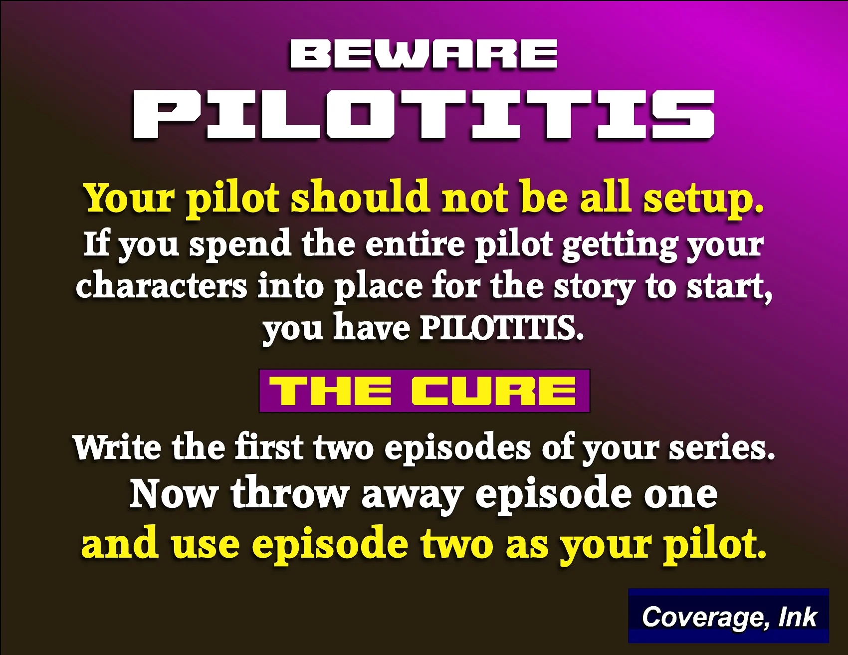 Alas, many of them are afflicted with a dread case of pilotitis — an insidious malady affecting four out of five of the the 1-hr pilots we see. This is our not-so-affectionate term for what the industry refers to as a “premise pilot.”